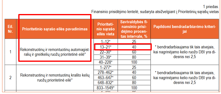 Pareiškėjas aiškiai identifikavęs objektą, dėl kurio siekia bendradarbiauti, nusistatęs į kurį AB „Via Lietuva“ viešai skelbiamą patvirtintą prioritetinį eilės sąrašą patenka planuojamas objektas, bei pasinaudojęs Metodikos priedo (6 psl.) esančia lentele suranda atitinkamą prioritetinės sąrašo eilės pavadinimą.