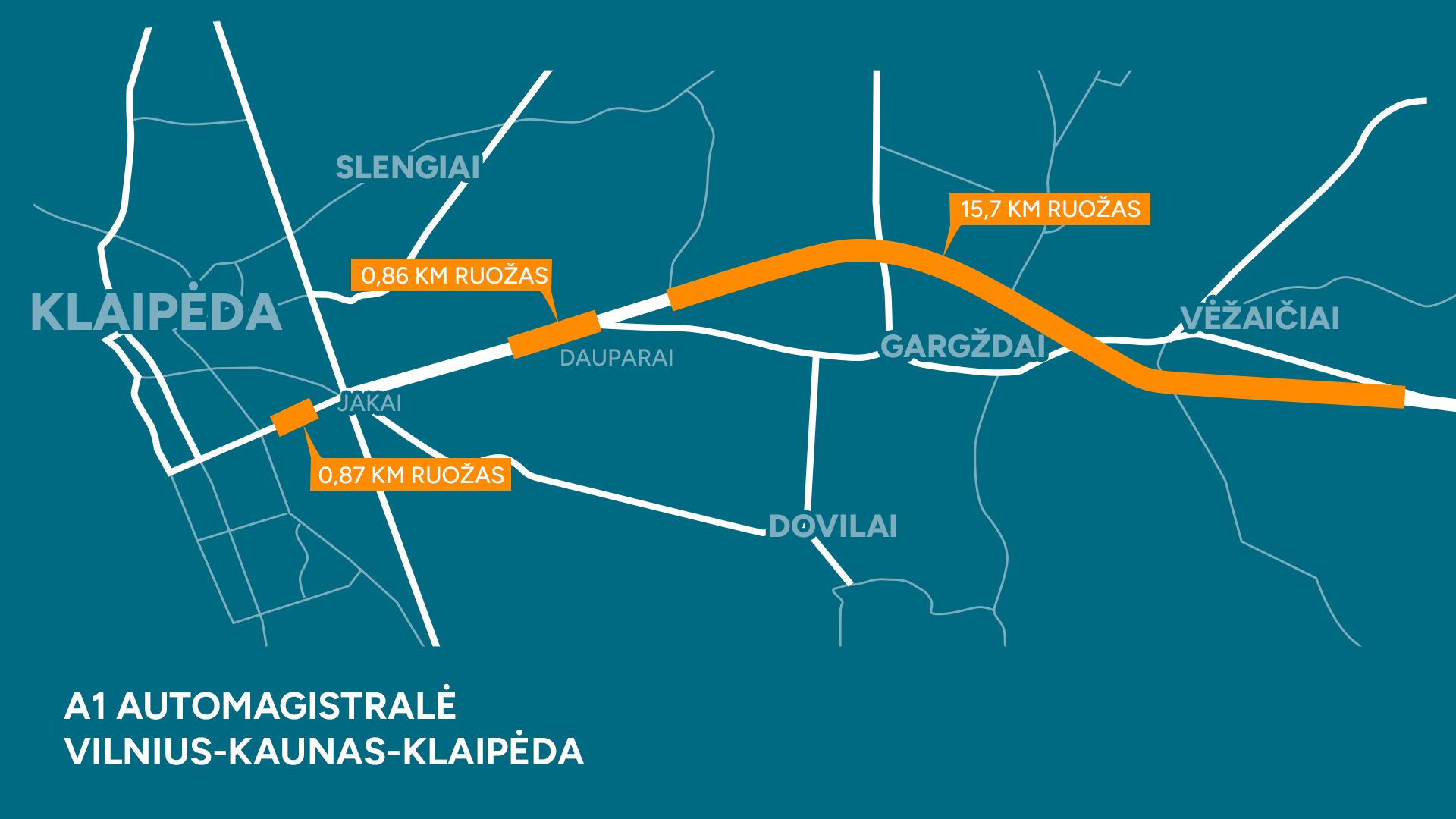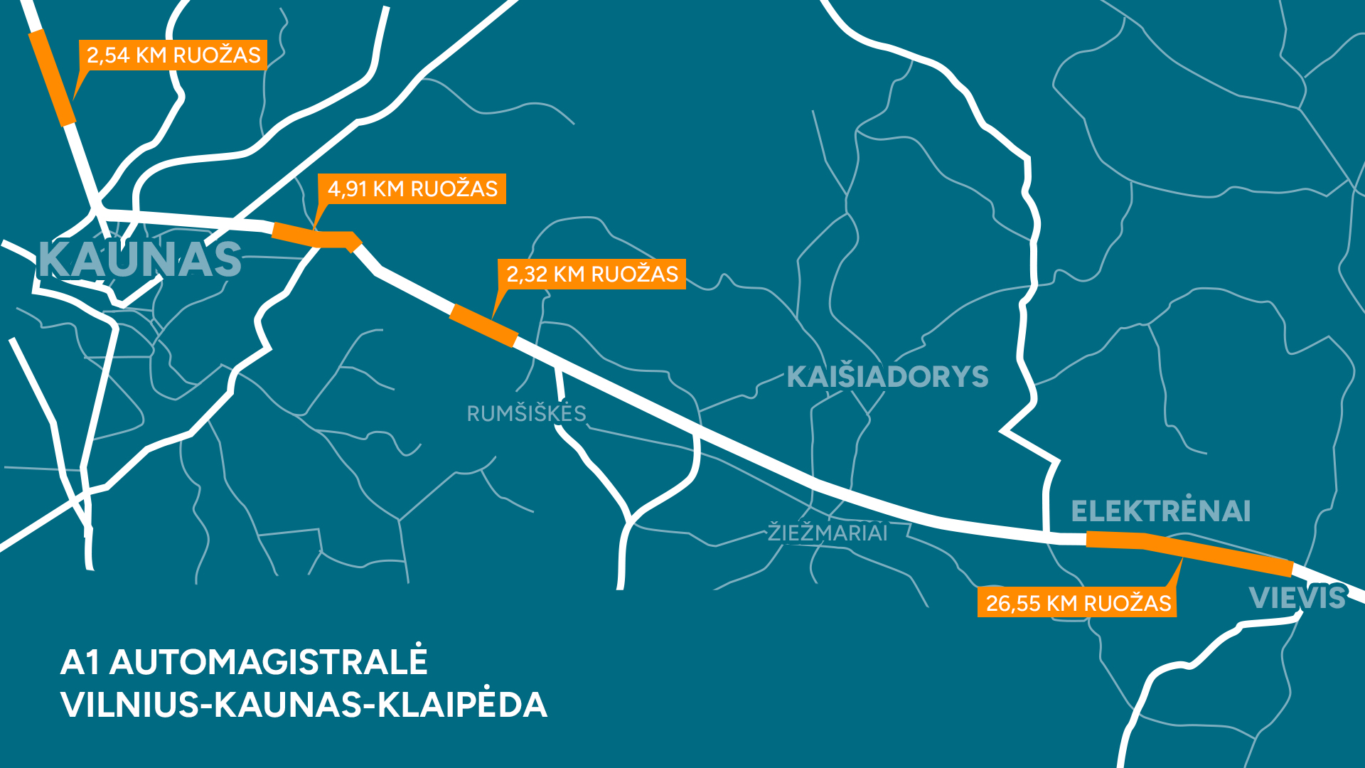 Automagistralėje A1 bus tvarkoma eilė skirtingų ruožų, įskaitant atkarpas nuo 39,29 iki 55,58 km (dešinėje pusėje, ties Elektrėnais) ir nuo 39,72 iki 50 km (kairėje pusėje), nuo 81,09 iki 83,42 km (dešinėje pusėje, Kauno prieigos), nuo 89,42 iki 94,34 km (dešinėje pusėje, Kauno prieigos), nuo 108,90 iki 111,44 km (dešinėje pusėje, Kauno prieigos), nuo 175,02 iki 182,93 km (dešinėje pusėje, ties Raseiniais), nuo 204,60 iki 207,67 km (kairėje pusėje, ties Kryžkalniu). Darbai taip pat numatyti ruožuose nuo 230,4 iki 234,96 km (dešinėje pusėje, ties Šilale), nuo 281,91 iki 297,66 km (kairėje pusėje, ties Gargždais) bei nuo 300,00 iki 300,86 km (dešinėje pusėje, Klaipėdos prieigos), nuo 305,63 iki 306,13 km (abiejose kelio pusėse, Klaipėdos prieigos).