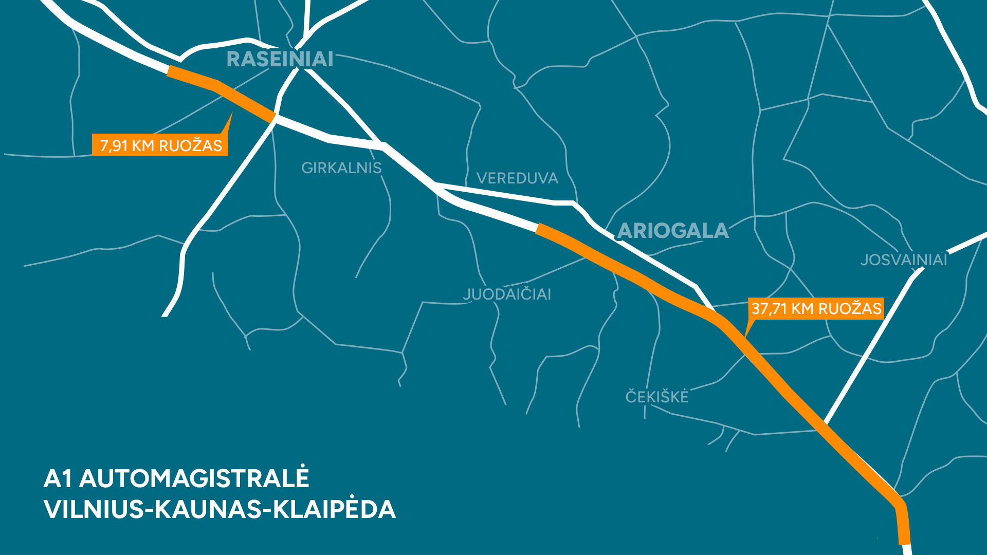 Ilgiausias automagistralėje A1 tvarkomas ruožas apims net apie 38 kilometrus – čia prasidės darbai ties Babtais (116,90 km) ir baigsis pravažiavus Ariogalą (iki 152,88 km) (dešinėje kelio pusėje), taip pat bus tvarkoma ir kairė kelio pusė nuo 146,16 iki 147,9 km. Be to, šiame ruože bus sutvarkyti net 10 tiltų ir viadukų.