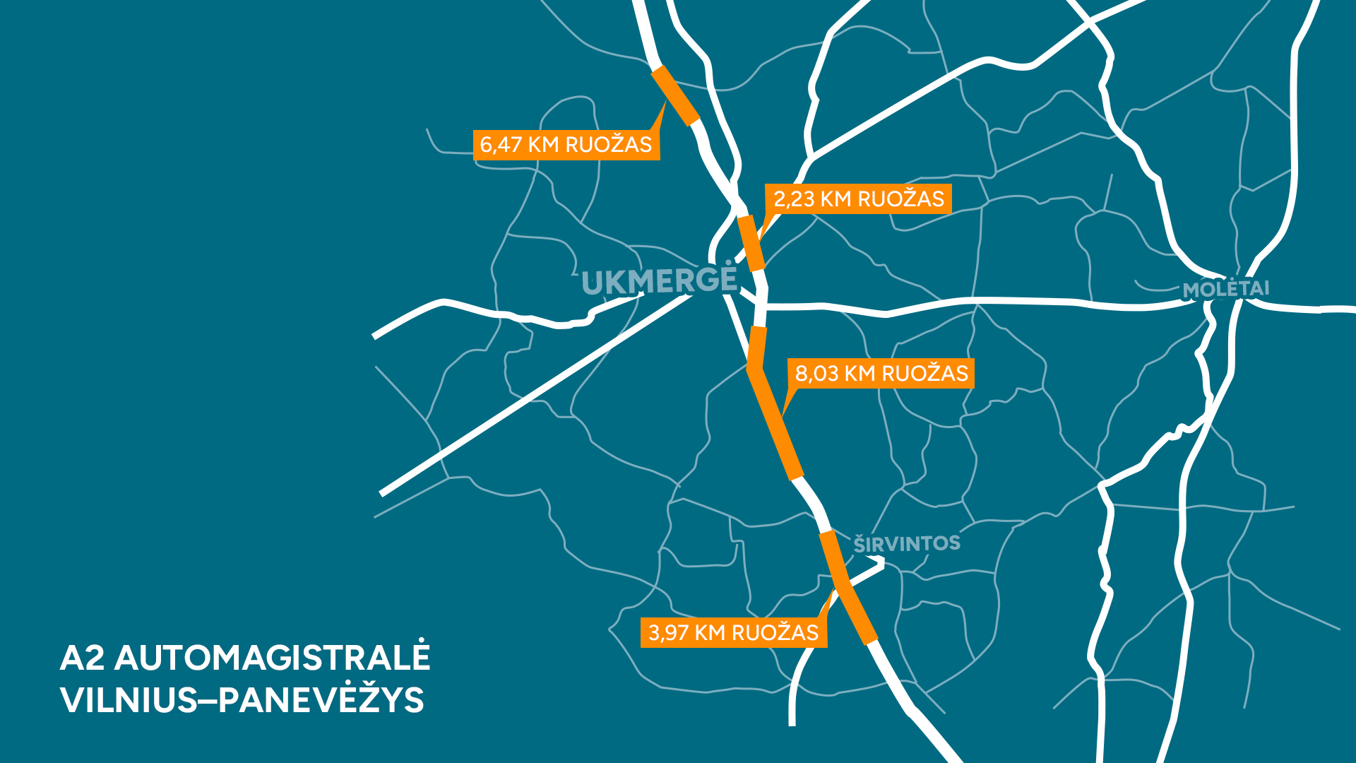 Kelyje A2 paprastasis remontas bus vykdomas keliuose ruožuose: nuo 45,20 iki 49,17 km (dešinėje pusėje, ties Širvintomis), nuo 57,57 iki 65,60 km (dešinėje pusėje, ties Ukmerge), nuo 72,96 iki 75,19 km (dešinėje pusėje, Ukmergės prieigos) ir nuo 91,46 iki 97,94 (dešinėje pusėje, ties Taujėnais).
