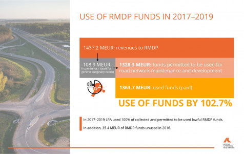 During the period of 2017–2019, 1437.2 million euros were collected from various sources to the Road Maintenance and Development Programme (in picture–RMDP) to finance roads. The Parliament gave a permission to use 1328.3 million euros out of 1437.2 million euros for the road network maintenance and development. Another part of 108.9 million euros was used for the other key areas of the national economy.