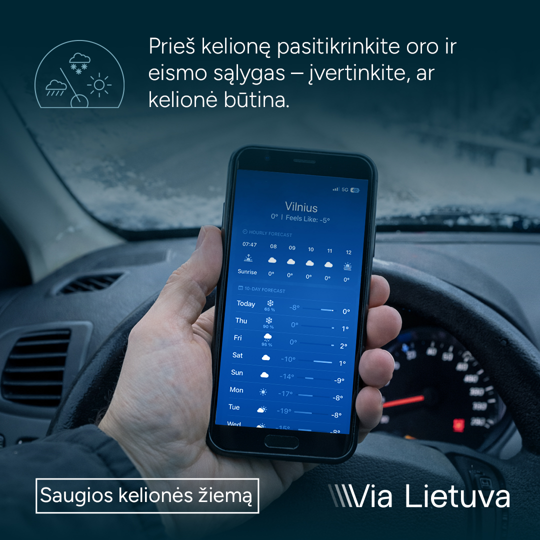 Saugios kelionės prasideda nuo plano. Prieš išvykstant patariama pasitikrinti oro ir eismo sąlygas bei, jei įmanoma, išvažiuoti anksčiau, kad nereikėtų skubėti. Kelyje svarbu rinktis saugų greitį, laikytis didesnio atstumo, vengti staigių manevrų ir būti ypač atidiems pavojingose vietose – posūkiuose, ant tiltų ar pavėsingose atkarpose, kur dažnai susidaro plikledis.