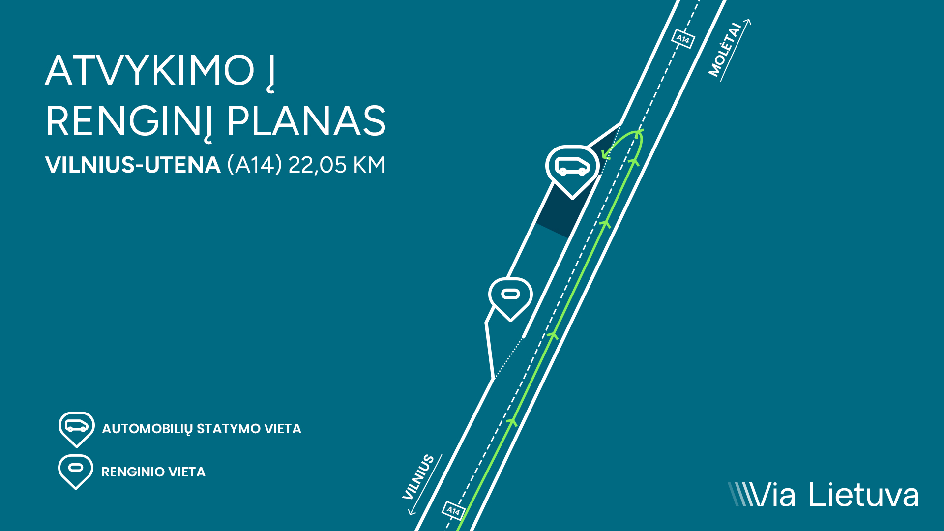 Balandžio 8 dieną, 10:30 val., jūsų laukiame kelyje Vilnius–Utena (A14) 22,05 km esančioje automobilių stovėjimo aikštelėje. Laiške prisegame renginio vietos schemą.
