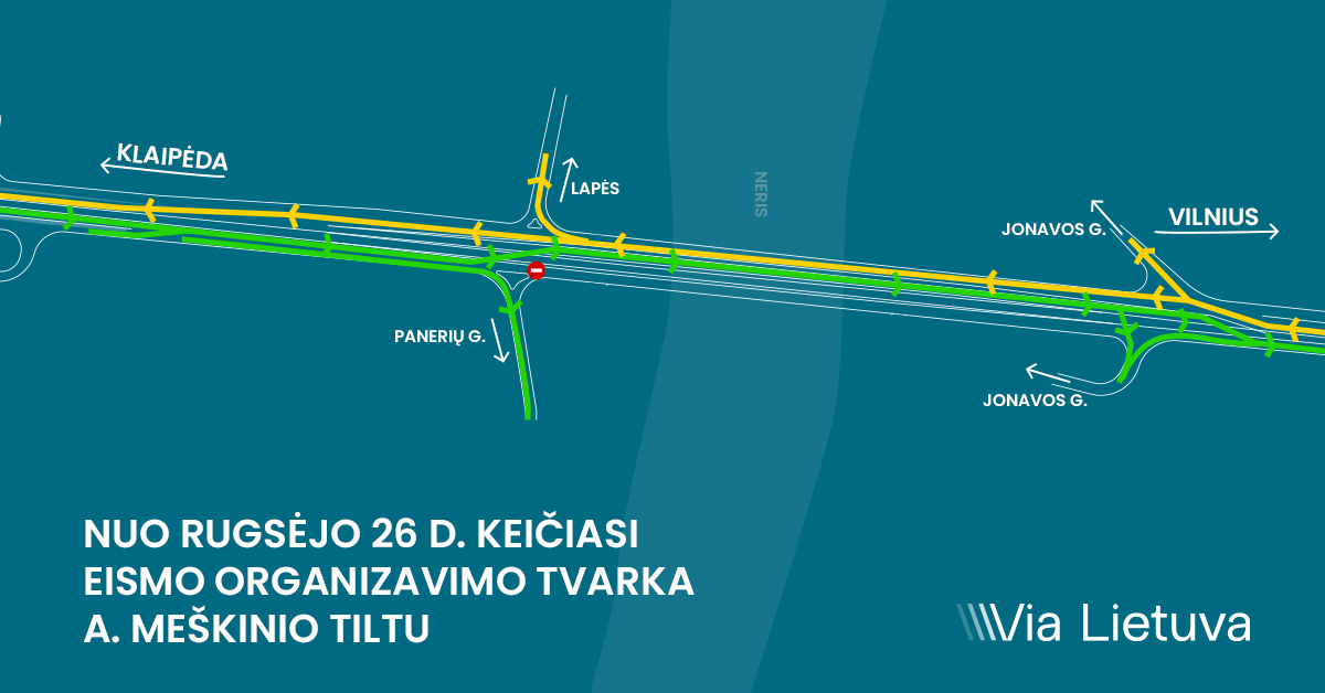 Akcinė bendrovė „Via Lietuva“ informuoja, kad nuo š. m. rugsėjo 26 dienos 11.00 val. keičiasi eismo organizavimas A. Meškinio (Kleboniškio) tiltu per Nerį – nuo Klaipėdos Vilniaus kryptimi eismas vyks vienu iš naujai pastatytų tiltų. Eismo organizavimas važiuojantiems Klaipėdos kryptimi nesikeičia. Tokia eismo organizavimo tvarka galios iki metų pabaigos, t. y. tol, kol bus baigti visi vidurinio tilto rekonstravimo darbai.