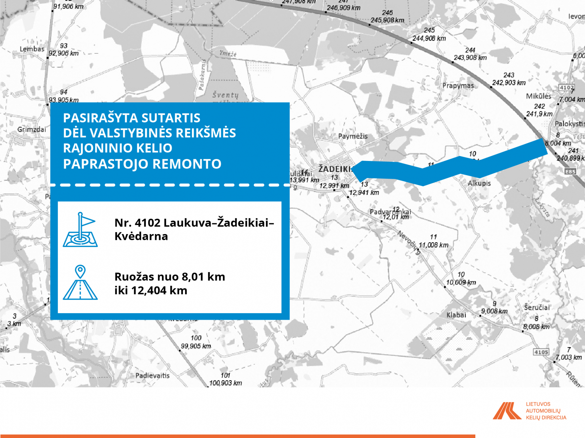 • Nr. 4102 Laukuva–Žadeikiai–Kvėdarna, ruožas nuo 8,01 iki 12,404 km;