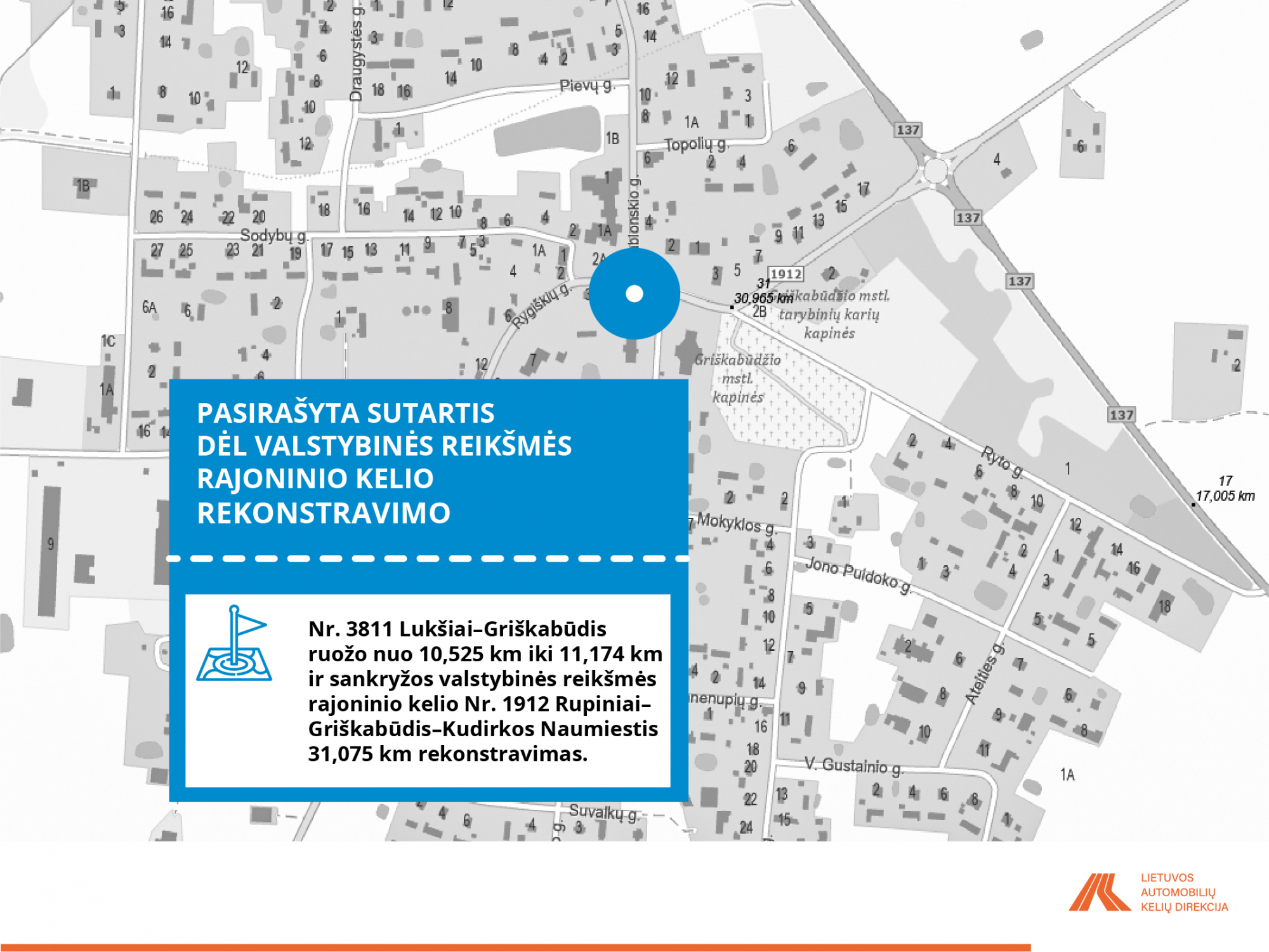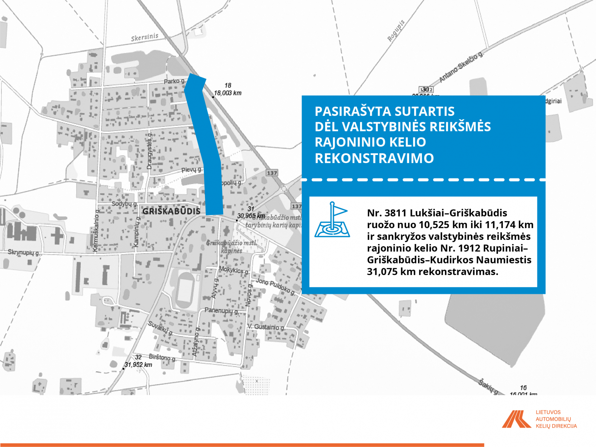 • Rajoninio kelio Nr. 3811 Lukšiai–Griškabūdis ruožas nuo 10,525 iki 11,174 km ir sankryžos valstybinės reikšmės rajoninio kelio Nr. 1912 Rupiniai–Griškabūdis–Kudirkos Naumiestis 31,075 km rekonstravimas.