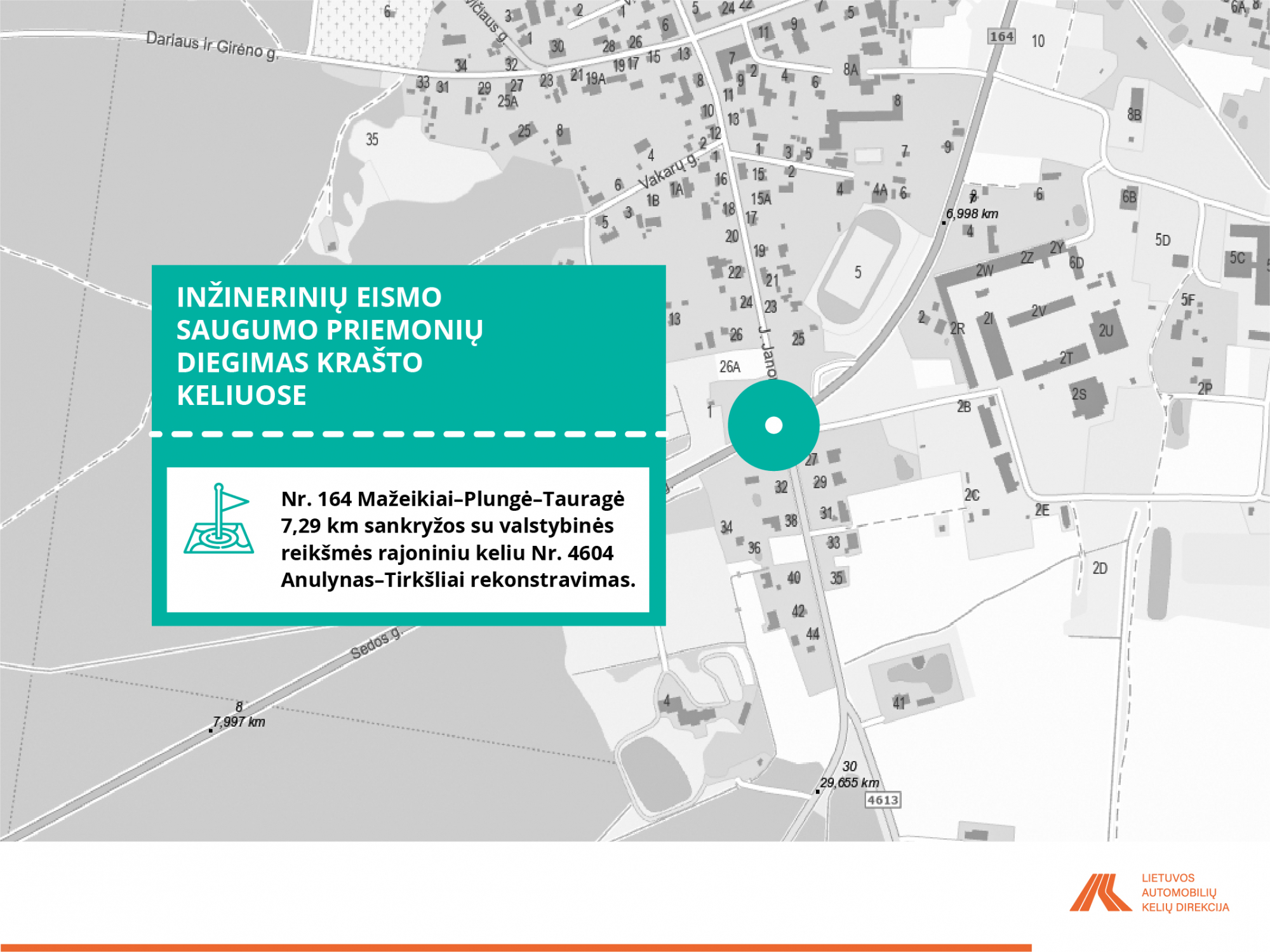 • Nr. 164 Mažeikiai– lungė–Tauragė 7,29 km sankryžos su valstybinės reikšmės rajoniniu keliu Nr. 4604 Anulynas-Tirkšliai rekonstravimas.