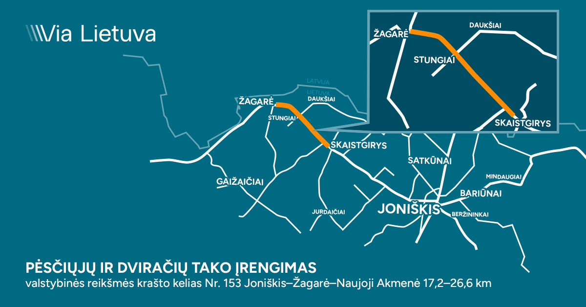 „Via Lietuva“ plečia darnaus judumo infrastruktūrą – pasirašytos sutartys dėl beveik 9 km ilgio pėsčiųjų ir dviračių tako tiesimo Joniškio r. savivaldybėje. Šiuo naujai nutiestu taku mėgstantieji keliauti dviračiais ar pėsčiomis nuo Skaistgirio miestelio galės saugiai nuvažiuoti iki Žagarės miesto. Taką planuojama įrengti iki kitų metų pabaigos.