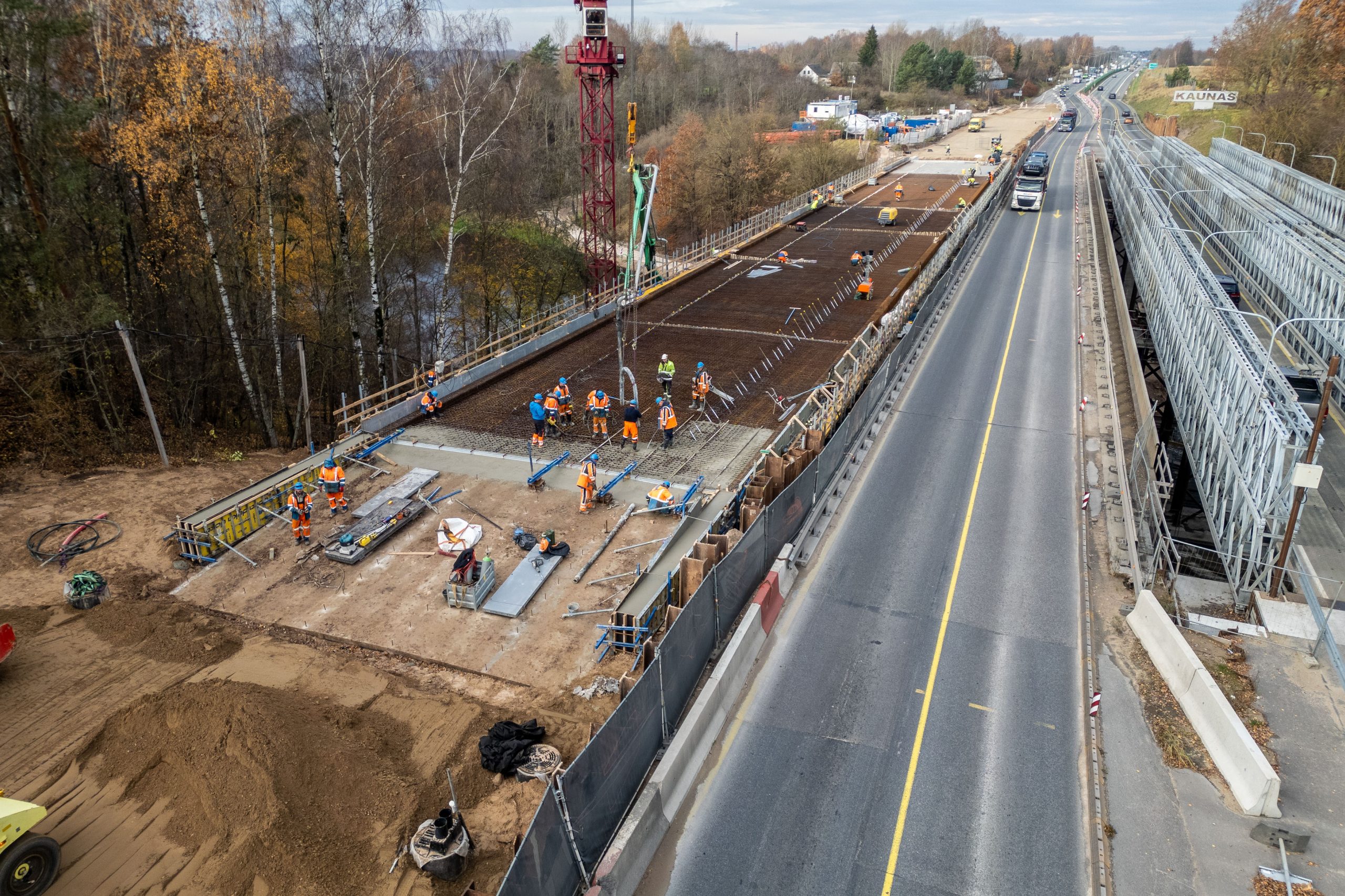 Intensyvūs darbai vyksta ne tik ant tilto, bet ir jo prieigose – abejose krantinėse įrengta ir stabilizuota sankasa, įrengti skaldos pagrindo ir asfalto pagrindo sluoksniai. Esant palankioms oro sąlygoms artimiausiu metu bus vykdomi kitų asfalto sluoksnių įrengimo darbai.